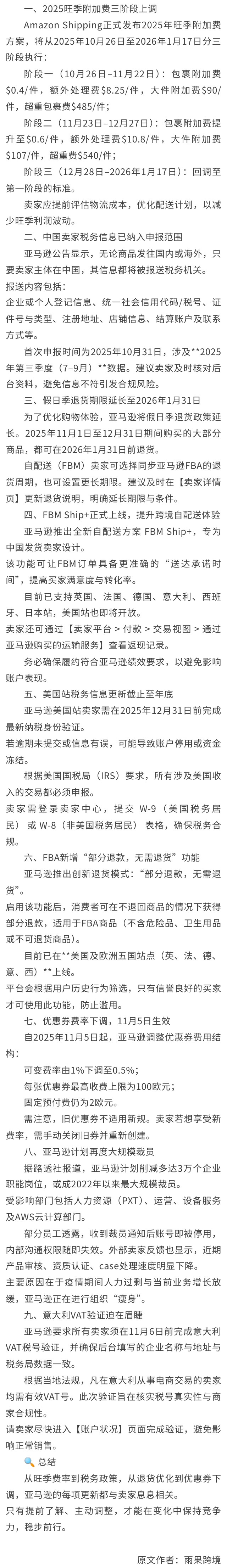 行业资讯 | 亚马逊十月重磅更新:旺季费率上调、税务新规来袭,卖家必看九大变化!